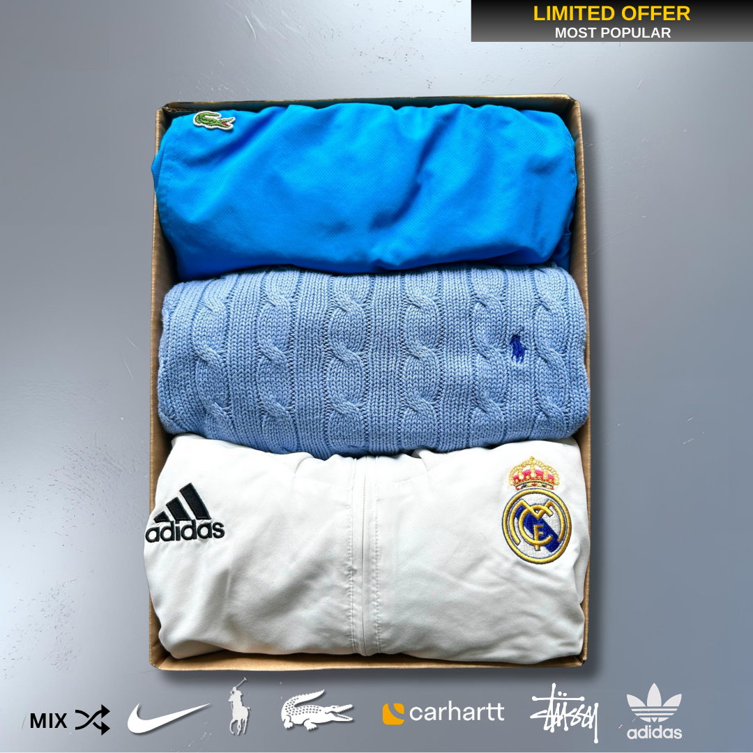 In unserer Beliebtesten Mystery Box befinden sich 3 / 5 Premium Vintage Pieces von Marken wie: Nike, Adidas, Lacoste, Ralph Lauren, Stüssy, Carhartt etc.
