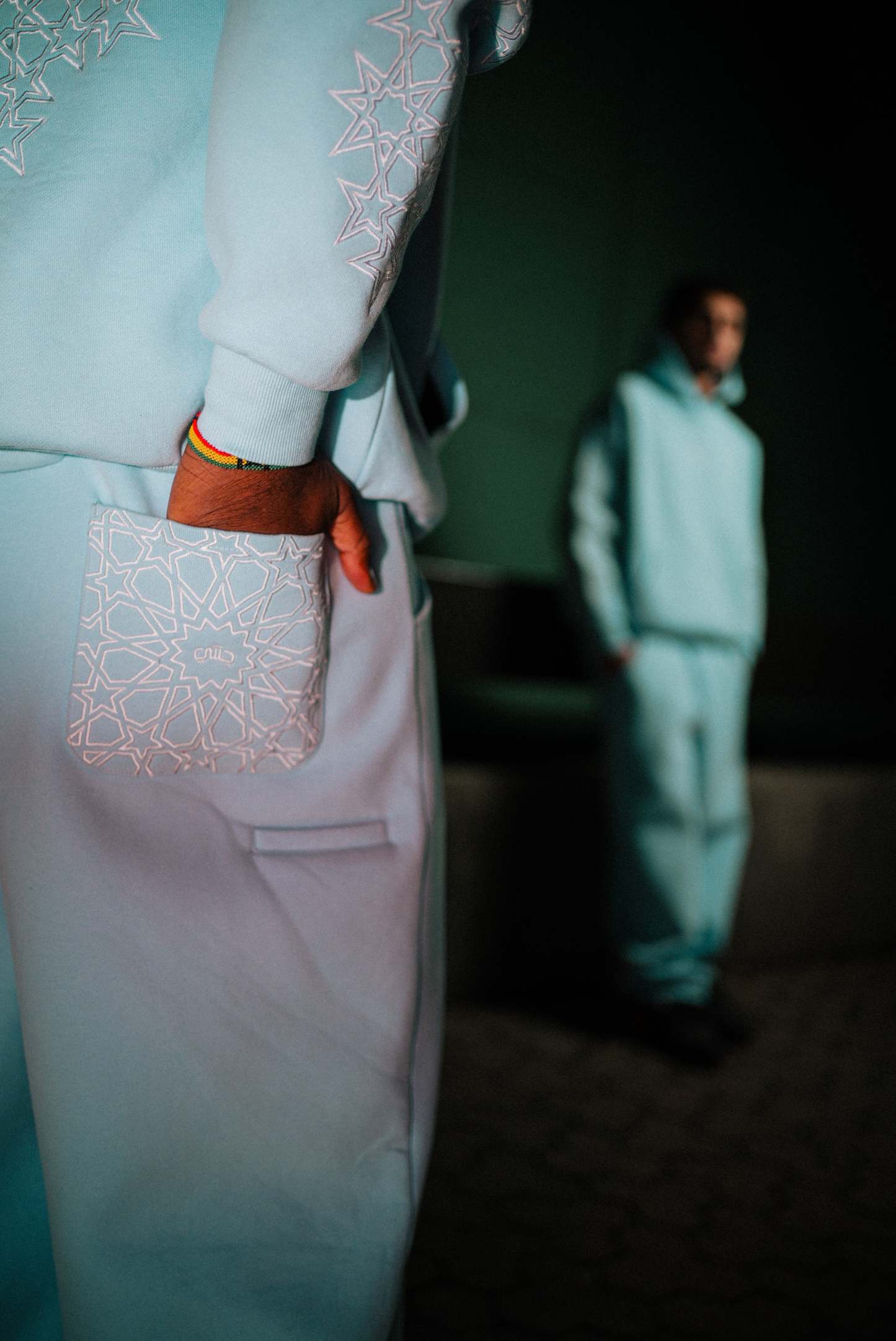 - Intricate Andalusian Zellige tile embroidery on pocket